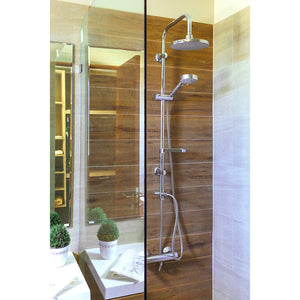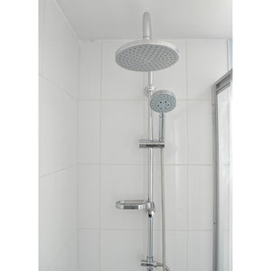 Columna de ducha con plato de 20 cm de diámetro, cuenta con soporte para maneral ajustable y porfa jabón.