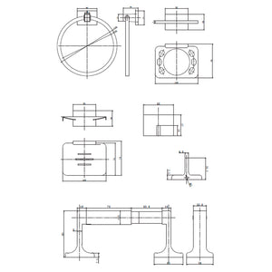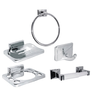 CARACTERÍSTICASIncluye Porta papel higiénico, gancho simple, aro toalla, porta cepillo, porta jabón.TERMINACIÓNCromo.FUNCIONAMIENTOFijación a muro por dos tornillos en cada soporte.