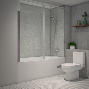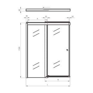 Mampara de Cristal templado de 8mm de espesor. Corredera de 1 hoja fija y 1 hoja móvil con traslape de 4,5 cm. Sistema de cierre con freno para evitar impacto y cierre suave. Tirador bala de aluminio de 32mm. Instalación entre muros terminados con revestimiento y sin desaplome. *Rango de ajuste según tabla ubicada en la parte inferior. Burlete plástico para evitar salida de agua.