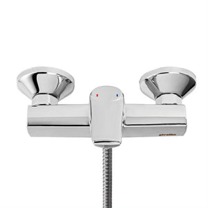 FUNCIONAMIENTOManilla con giro en 90° que permite mezclar la temperatura del agua.CONEXIÓNPor 2 excéntricas S G 1/2”.TIPO DE CIERRECartucho Cerámico 35mm.INCLUYE2 Excéntricas, 2 campanas, flexible 1,75 mts., maneral y soporte móvil.