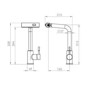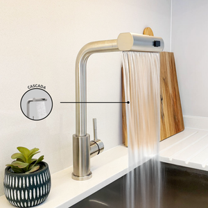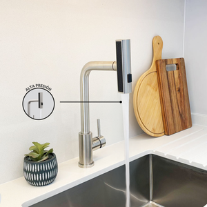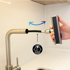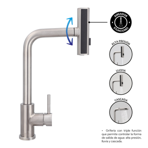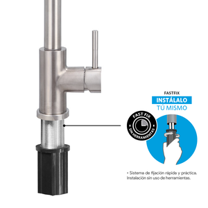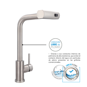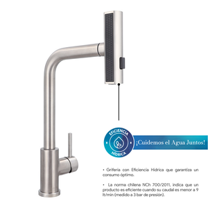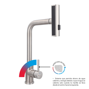 Cartucho cerámico con apertura en frío que permite ahorro de energía. La manilla cuenta con giro en 90° que permite regular la temperatura del agua.