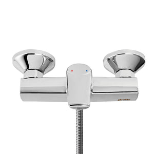 FUNCIONAMIENTOManilla con giro en 90° que permite mezclar la temperatura del agua.CONEXIÓNPor 2 excéntricas S G 1/2”.TIPO DE CIERRECartucho Cerámico 35mm.MATERIALCuerpo polímero de Alta Resistencia (ABS) y manilla metálica.CONSUMO<12 L/min a 3 bares.<9 L/min a 3 bares (Restrictor 60%).NORMATIVACumple con norma Chilena Nch 700-2011.INCLUYE2 Excéntricas, 2 campanas, flexible 1,75 m, maneral 1 función y soporte móvil. Restrictor de agua para maneral